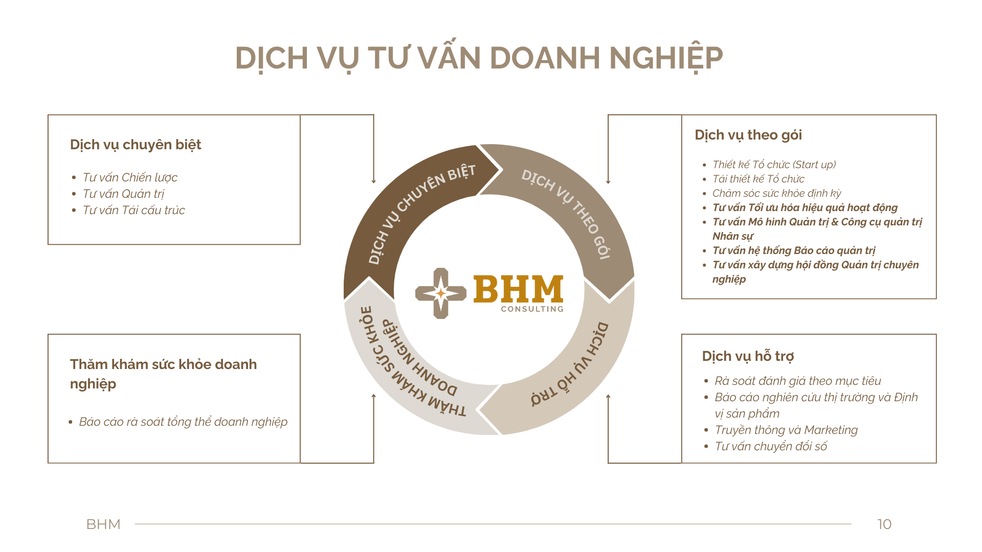 BHM là một tổ chức cung cấp dịch vụ tư vấn chuyên nghiệp, tập trung vào việc hỗ trợ doanh nghiệp trong các lĩnh vực như chiến lược, quản trị, tái cấu trúc, và tối ưu hóa hoạt động. BHM giúp các doanh nghiệp phát triển bền vững thông qua các giải pháp tùy chỉnh, thiết kế tổ chức, quản trị nhân sự, và chuyển đổi số. Mục tiêu của BHM là nâng cao hiệu quả hoạt động và hỗ trợ doanh nghiệp đạt được mục tiêu kinh doanh một cách hiệu quả.